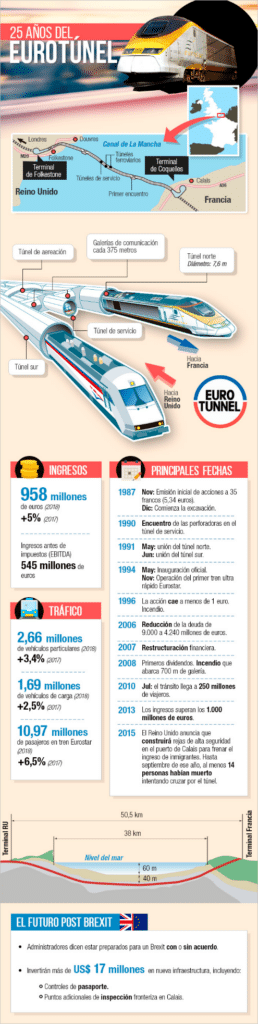 Estas navidades miles de personas se han enfrentado al cierre del eurotúnel debido a la nueva cepa de la COVID-19. Este túnel ferroviario que une Francia con el Reino Unido desde 1994 es una de las infraestructuras más importantes del continente europeo. La travesía se puede hacer en coche particular o bien como pasajero, en un viaje que dura unos 35 minutos entre la ciudad de Calais (Francia) y Folkestone (Reino Unido). Hoy en día, es el tercer túnel más largo del mundo, solo superado por el túnel de Seikan (Japón) y el túnel de San Gotardo (Suiza). El coste de la obra fue de 16000 millones de euros.