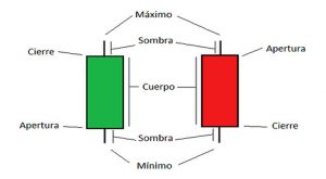 En primer lugar, el cuerpo de los gráficos de vela japonesa suelen ser verdes o rojos. Si es verde indica que en ese periodo de tiempo el precio de cotización del bien ha subido, esto es, el precio de cierre es superior al de apertura. Sin embargo, si es de color rojo, quiere decir que el precio de cotización está bajando o, lo que es lo mismo, el precio de cierre es menor que el de apertura. Además, estas velas pueden ser fraccionadas en los periodos de tiempo que se desee y, de este modo, ver la evolución del precio de cotización del bien en periodos de 1 minuto, 15 minutos, 1 hora, 1 día, etc. Por otro lado, las sombras (apéndices verticales y alargados en los extremos de las velas) aportan información sobre cómo ha evolucionado el precio de la vela en la fracción de tiempo escogida (1 minuto, 15 minutos…). Las sombras pueden ser alargadas o cortas. Las alargadas indican que en ese periodo de tiempo ha habido algún momento que el bien ha cotizado a un precio muy superior o inferior respecto al cierre y/o apertura.