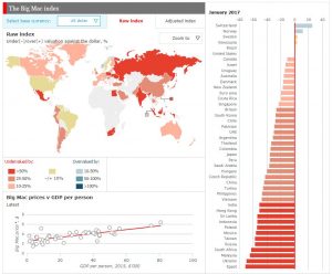 “Big Mac Index” es un índice elaborado a partir de una investigación no científica por The Economist, que pretende servir para comparar el poder adquisitivo de los países donde se vende la famosa hamburguesa de la cadena McDonald`s y para saber si las monedas de esos países están sub o sobrevaluadas respecto al dólar estadounidense.