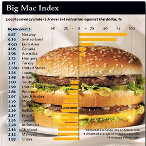 “Big Mac Index” es un índice elaborado a partir de una investigación no científica por The Economist, que pretende servir para comparar el poder adquisitivo de los países donde se vende la famosa hamburguesa de la cadena McDonald`s y para saber si las monedas de esos países están sub o sobrevaluadas respecto al dólar estadounidense.