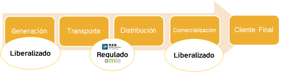 4. Comercialización: Actividad liberalizada mediante la cual la compañía comercializadora factura la energía consumida al cliente final y actúa de intermediaria entre la distribuidora y el cliente. El precio de la energía es libremente pactado entre el cliente y la comercializadora y está compuesto por una parte regulada (también llamada Tarifa de Acceso) y una parte no regulada, la suma de ambos conceptos da como resultado el precio de la energía que el cliente consume. Asimismo, se pactan entre las partes el resto de condiciones del contrato de suministro eléctrico.