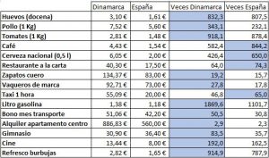 No hay duda que el precio de los productos es más caro en Dinamarca que en España, pero al contextualizar el sueldo con el nivel de precios, el poder adquisitivo de los daneses es superior en la mayoría de los bienes y servicios. Tan sólo es más barato en España (en relación al salario-precio) el café, la cerveza, una cena en un restaurante y una hora de taxi. No obstante, estos bienes y servicios en los que España está mejor situada, no son de primera necesidad y, por lo tanto, se puede sobrevivir sin su consumo.