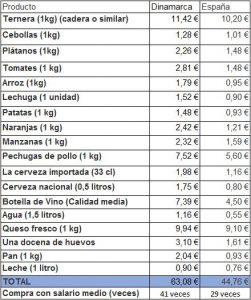 Esta cesta de la compra, con el salario medio neto de Dinamarca (2.580 euros), podría comprarse 41 veces, mientras que con el salario medio neto de España (1.300 euros) podría hacerse 29 veces. Es decir, para que España se igualase a Dinamarca, en relación a la capacidad de compra de una cesta de productos básicos, tendría que tener un salario neto de 1.835 euros.